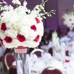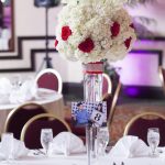 Stunning crystal clusters & chandeliers hung alongside balls of red and white flowers from the ceiling, while surrounded  by gorgeous white and pink curtains to make for a romantic evening. Each table was complete with extravagant clear vase-like centerpieces filled with white hydrangeas & red roses. Some of the rose petals surrounded the centerpieces for an extra hint of color. A fun DIY touch to this wedding was pictures of the couple holding up a number on each table to serve as the table number design!